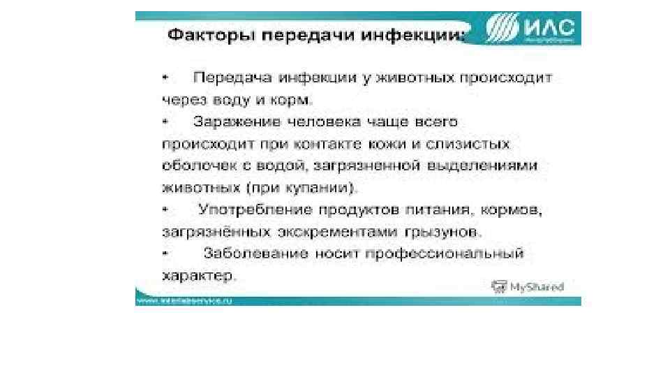 Механизм и путь передачи. Механизм передачи — контактный. Путь передачи — водный, меньшее значение имеют контактный и пищевой (кормовой). Ворота инфекции в организме человека и животного незначительные повреждения кожи и неповреждённые слизистые оболочки полости рта, носа, глаз, ЖКТ и мочеполового тракта.