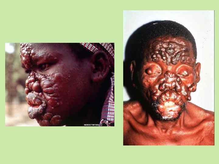 ФОРМЫ ЗАБОЛЕВАНИЯ l Туберкулоидная лепра Поражение кожи и периферических нервов. Гранулемы-эпителоидные клетки в окружении лимфоцитов, гигантских клеток, плазматических , тучных клеток. Поражения нервных ганглиев и стволов-параличи, контрактуры, трофические нарушения и др. l Лепроматозная лепра Разнообразные кожные проявления, микобактерии на слизистой носа, «львиная морда» . Гранулемы-лепрозные клетки, мононуклеарные, плазматические клетки, гистиоциты, фибробласты. Поражения внутренних органов, шванновских клеток. Лимфаденит. Потеря зрения. l l Пограничная (диморфная) лепра Недифференцированная лепра