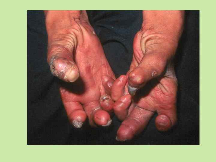 КЛИНИЧЕСКАЯ КАРТИНА ЗАБОЛЕВАНИЯ l l Кожные поражения расположены на лице, тыльной стороне кистей, предплечьях, голенях и представлены ограниченными бугорками (лепромами). Наблюдается поражение слизистых оболочек носа, полости рта, гортани. Поражение глаз вызывает нарушение зрительной функции и даже полную слепоту. Поражения нервных ганглиев и стволовпараличи, контрактуры, трофические нарушения и т. д.