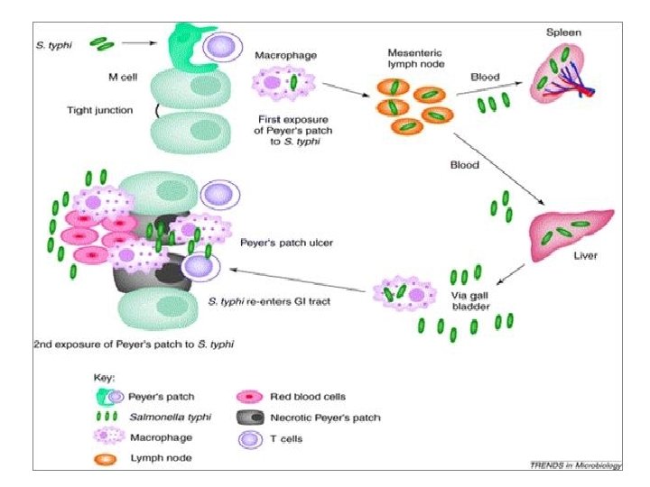 Патогенез брюшного тифа • После попадания в ЖКТ часть сальмонелл погибает в кислом содержимом желудка; часть попадает в тонкий кишечник • После адгезии сальмонелла захватывается М-клеткой и транспортируется в подслизистую в лимфоидные клетки (Пейеровы бляшки) • Благодаря антифагоцитарным факторам сальмонелла размножается в лимфоцитах и попадает в лимфоток, далее в кровоток; = Инкубационный период • В крови часть сальмонелл будет разрушена (факторы естественной резистентности) и высвободится эндотоксин = Начало заболевания