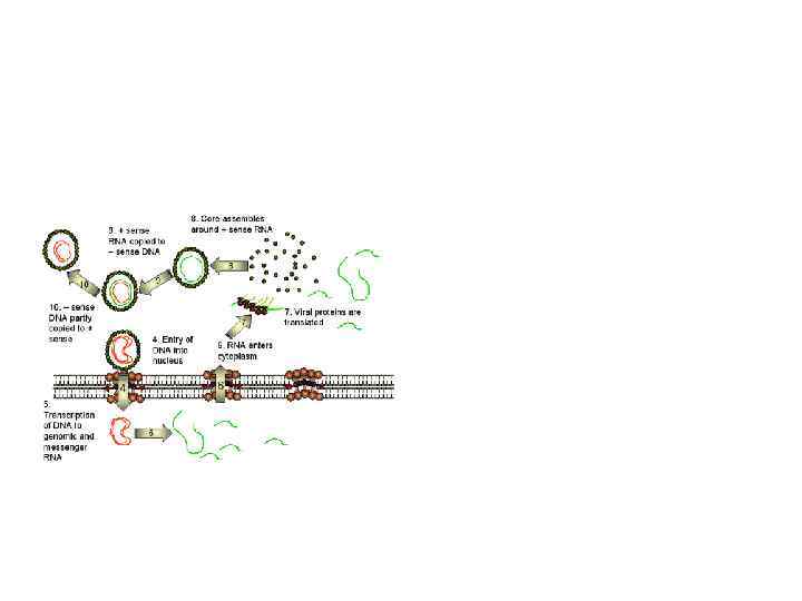 Ротавирусы, репликация • • • Проникновение в клетку путём рецепторно-индуцированного эндоцитоза VP 4 разрывает мембрану эндосомы, VP 7 деградирует на субъеденицы РНК-зависимая РНК-полимераза создаёт и. РНК транскрипты вирусной РНК и белков вируса Вокруг ядра формируется вироплазма белками NSP 5 и NSP 2, в которой аккумулируются вирусные белки и копии вирусной РНК, там же происходит сборка вируса Вирусные частицы мигрируют в эндоплазматическую сеть, где покрываются внешними белками, затем покидают клетку
