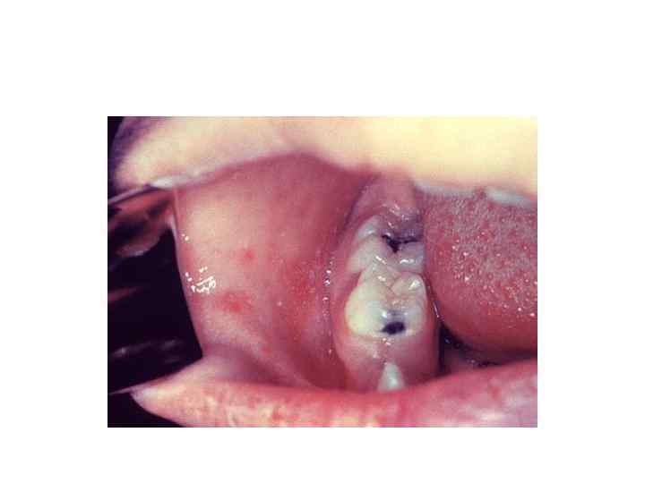 • Продромальный период длится 3 5 дней и характеризуется вирусемией (циркуляция вируса в крови), с локализацией вируса в верхних дыхательных путях и других органах: • катар верхних дыхательных путей (обильные слизистые из носа, грубый/сухой/навязчивый кашель с осиплостью голоса) • конъюнктивит (отёк и гиперемия слизистой оболочки глаза, с серозным отделяемым, инъекция сосудов склер, слезотечение и светобоязнь) • лихорадка (подъём t⁰ до 38, 5⁰С) • интоксикация (вялость, раздражительность, снижение аппетита, нарушение сна) • Энантема = пятна Бельского Филатова Коплика – это пятна в виде манной крупы (маленькие белесоватые, с краснотой по краям), располагаются на слизистой щёк около коренных зубов, также могут быть на слизистой губ и десен. Они появляются за 2 3 дня до появления высыпаний (или иными словами через 1 2 дня после начала катаральных проявлений) и, когда появляются высыпания на коже, то эти пятнышки на слизистой исчезают. • Мелкие точечные красноватые высыпания на язычке, мягком и твёрдом нёбе – они появляются на 2 3 день болезни и сохраняются до конца периода высыпаний.