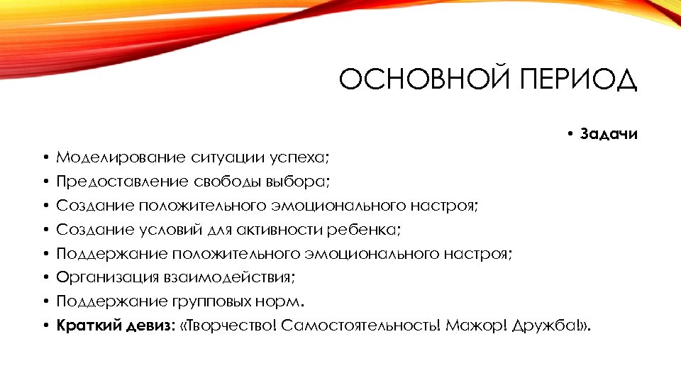 ОСНОВНОЙ ПЕРИОД • Задачи • Моделирование ситуации успеха; • Предоставление свободы выбора; • Создание положительного эмоционального настроя; • Создание условий для активности ребенка; • Поддержание положительного эмоционального настроя; • Организация взаимодействия; • Поддержание групповых норм. • Краткий девиз: «Творчество! Самостоятельность! Мажор! Дружба!» .