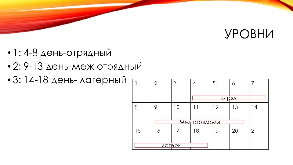 УРОВНИ • 1: 4 8 день отрядный • 2: 9 13 день меж отрядный • 3: 14 18 день лагерный 1 2 3 4 5 6 7 отряд 8 9 10 11 12 13 14 20 21 Мед отрядами 15 16 17 лагерь 18 19