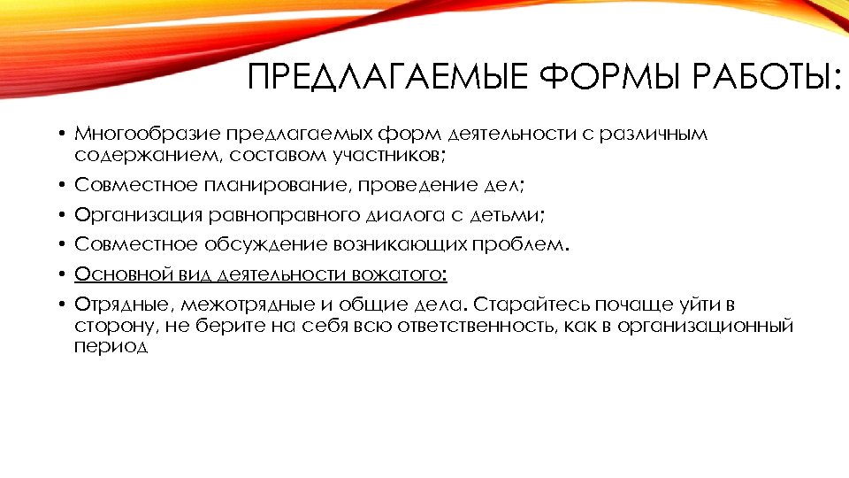 ПРЕДЛАГАЕМЫЕ ФОРМЫ РАБОТЫ: • Многообразие предлагаемых форм деятельности с различным содержанием, составом участников; • Совместное планирование, проведение дел; • Организация равноправного диалога с детьми; • Совместное обсуждение возникающих проблем. • Основной вид деятельности вожатого: • Отрядные, межотрядные и общие дела. Старайтесь почаще уйти в сторону, не берите на себя всю ответственность, как в организационный период