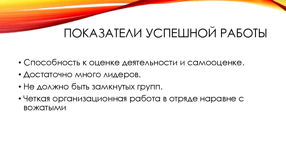 ПОКАЗАТЕЛИ УСПЕШНОЙ РАБОТЫ • Способность к оценке деятельности и самооценке. • Достаточно много лидеров. • Не должно быть замкнутых групп. • Четкая организационная работа в отряде наравне с вожатыми