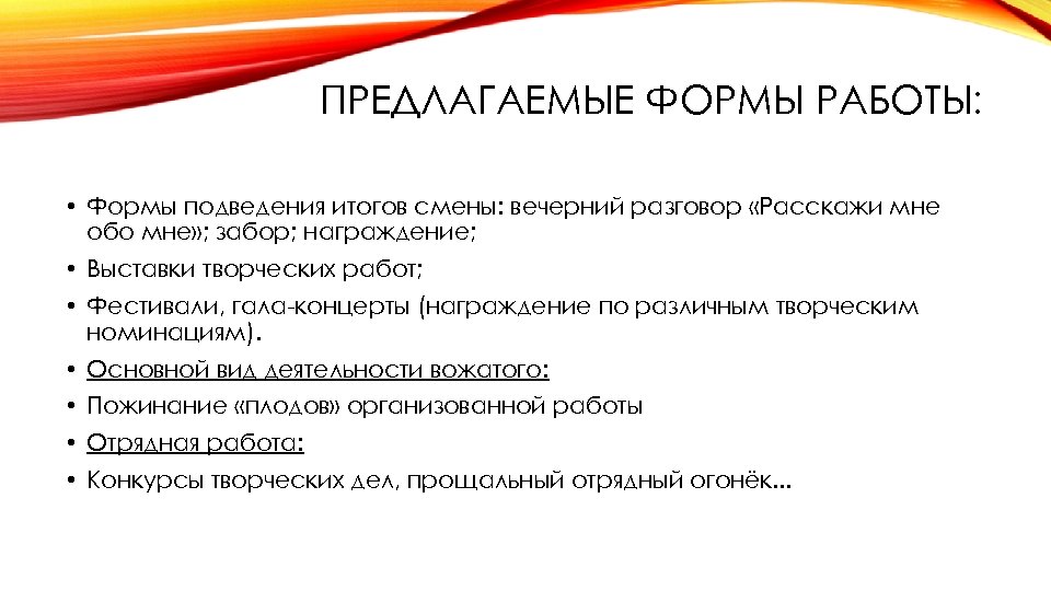 ПРЕДЛАГАЕМЫЕ ФОРМЫ РАБОТЫ: • Формы подведения итогов смены: вечерний разговор «Расскажи мне обо мне» ; забор; награждение; • Выставки творческих работ; • Фестивали, гала концерты (награждение по различным творческим номинациям). • Основной вид деятельности вожатого: • Пожинание «плодов» организованной работы • Отрядная работа: • Конкурсы творческих дел, прощальный отрядный огонёк. . .