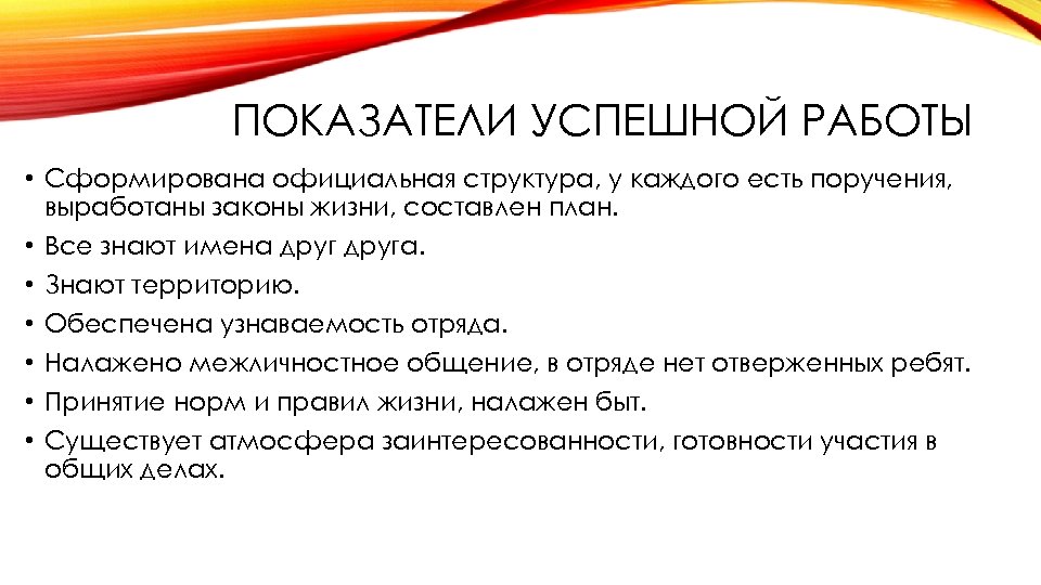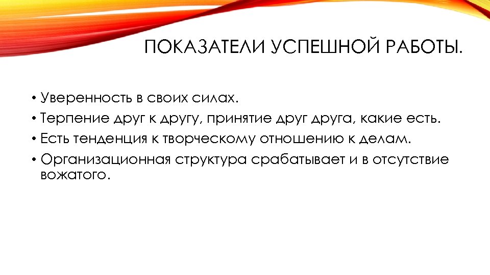 ПОКАЗАТЕЛИ УСПЕШНОЙ РАБОТЫ. • Уверенность в своих силах. • Терпение друг к другу, принятие друга, какие есть. • Есть тенденция к творческому отношению к делам. • Организационная структура срабатывает и в отсутствие вожатого.