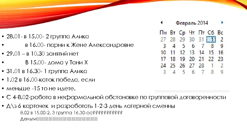 • 28. 01 в 15. 00 2 группа Алика • в 16. 00 парни к Жене Александровне • 29. 01 – в 10. 30 занятий нет • В 15. 00 дома у Тани Х • 31. 01 в 16. 30 1 группа Алика • 1. 02 в 16. 00 каток победа, если • меньше 15 то не идете. • С 4 8. 02 работа в неформальной обстановке по групповой договоренности • Дз 6 карточек и разработать 1 2 3 день лагерной сменны 8. 02 в 15. 00 2, 3 группа 16. 30 ос? ? ? Деньги!!!!!!!!!!!!!!!!!!!!!!!