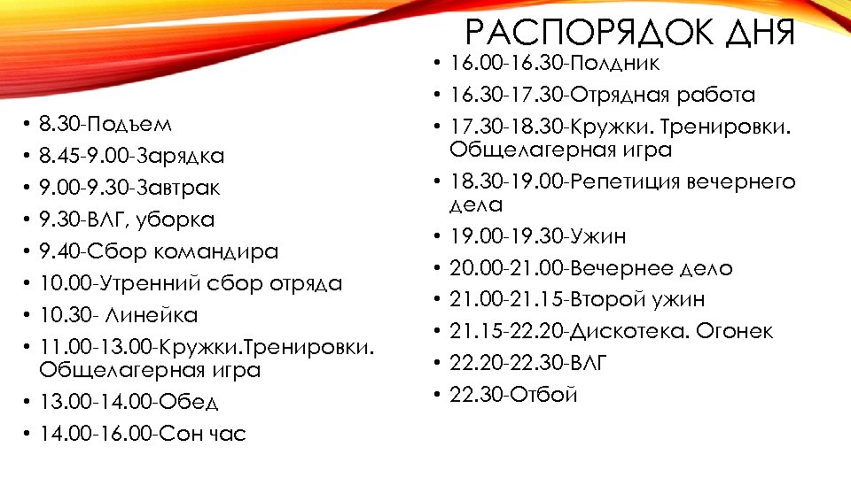 РАСПОРЯДОК ДНЯ 8. 30 Подъем 8. 45 9. 00 Зарядка 9. 00 9. 30 Завтрак 9. 30 ВЛГ, уборка 9. 40 Сбор командира 10. 00 Утренний сбор отряда 10. 30 Линейка 11. 00 13. 00 Кружки. Тренировки. Общелагерная игра • 13. 00 14. 00 Обед • 14. 00 16. 00 Сон час • • • 16. 00 16. 30 Полдник • 16. 30 17. 30 Отрядная работа • 17. 30 18. 30 Кружки. Тренировки. Общелагерная игра • 18. 30 19. 00 Репетиция вечернего дела • 19. 00 19. 30 Ужин • 20. 00 21. 00 Вечернее дело • 21. 00 21. 15 Второй ужин • 21. 15 22. 20 Дискотека. Огонек • 22. 20 22. 30 ВЛГ • 22. 30 Отбой