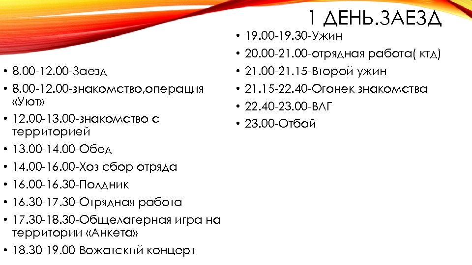 • 8. 00 12. 00 Заезд • 8. 00 12. 00 знакомство, операция «Уют» • 12. 00 13. 00 знакомство с территорией • 13. 00 14. 00 Обед • 14. 00 16. 00 Хоз сбор отряда • 16. 00 16. 30 Полдник • 16. 30 17. 30 Отрядная работа • 17. 30 18. 30 Общелагерная игра на территории «Анкета» • 18. 30 19. 00 Вожатский концерт • • • 1 ДЕНЬ. ЗАЕЗД 19. 00 19. 30 Ужин 20. 00 21. 00 отрядная работа( ктд) 21. 00 21. 15 Второй ужин 21. 15 22. 40 Огонек знакомства 22. 40 23. 00 ВЛГ 23. 00 Отбой