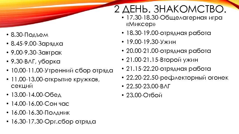 2 ДЕНЬ. ЗНАКОМСТВО. • • • 8. 30 Подъем 8. 45 9. 00 Зарядка 9. 00 9. 30 Завтрак 9. 30 ВЛГ, уборка 10. 00 11. 00 Утренний сбор отряда 11. 00 13. 00 открытие кружков, секций 13. 00 14. 00 Обед 14. 00 16. 00 Сон час 16. 00 16. 30 Полдник 16. 30 17. 30 Орг. сбор отряда • 17. 30 18. 30 Общелагерная игра «Миксер» • 18. 30 19. 00 отрядная работа • 19. 00 19. 30 Ужин • 20. 00 21. 00 отрядная работа • 21. 00 21. 15 Второй ужин • 21. 15 22. 20 отрядная работа • 22. 20 22. 50 рефлекторный огонек • 22. 50 23. 00 ВЛГ • 23. 00 Отбой