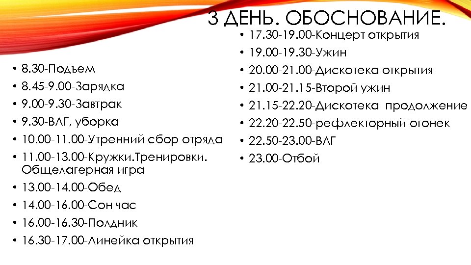 3 ДЕНЬ. ОБОСНОВАНИЕ. • • • 8. 30 Подъем 8. 45 9. 00 Зарядка 9. 00 9. 30 Завтрак 9. 30 ВЛГ, уборка 10. 00 11. 00 Утренний сбор отряда 11. 00 13. 00 Кружки. Тренировки. Общелагерная игра 13. 00 14. 00 Обед 14. 00 16. 00 Сон час 16. 00 16. 30 Полдник 16. 30 17. 00 Линейка открытия • • 17. 30 19. 00 Концерт открытия 19. 00 19. 30 Ужин 20. 00 21. 00 Дискотека открытия 21. 00 21. 15 Второй ужин 21. 15 22. 20 Дискотека продолжение 22. 20 22. 50 рефлекторный огонек 22. 50 23. 00 ВЛГ 23. 00 Отбой