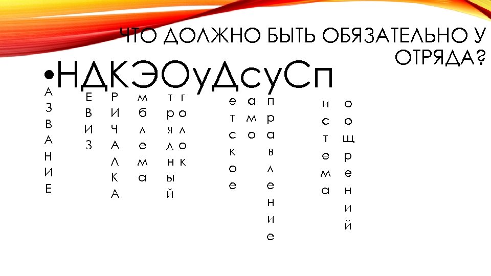 ЧТО ДОЛЖНО БЫТЬ ОБЯЗАТЕЛЬНО У ОТРЯДА? • НДКЭОу. Дсу. Сп А З В А Н И Е Е В И З Р И Ч А Л К А м б л е м а т р я д н ы й г о л о к е а п т м р с о а к в о л е е н и е и о с о т щ е р м е а н и й