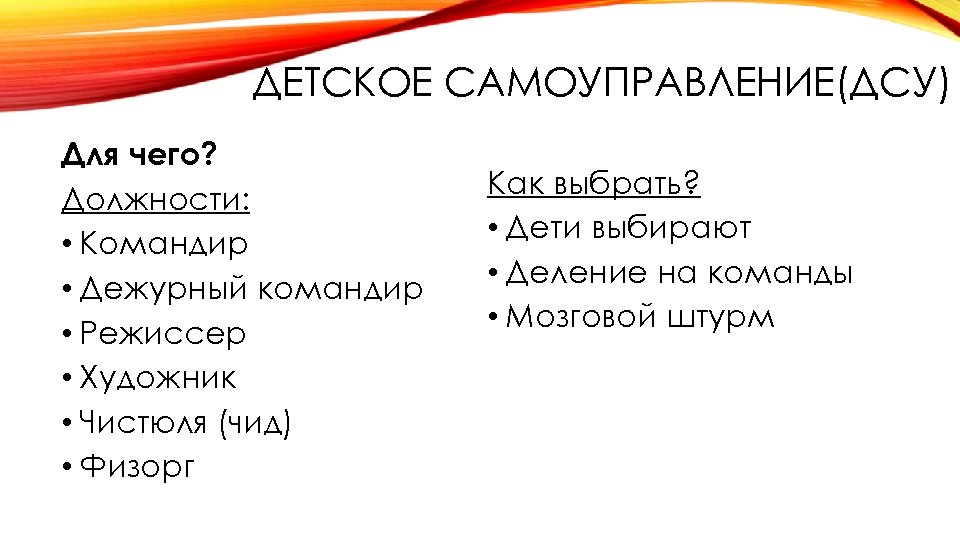 ДЕТСКОЕ САМОУПРАВЛЕНИЕ(ДСУ) Для чего? Должности: • Командир • Дежурный командир • Режиссер • Художник • Чистюля (чид) • Физорг Как выбрать? • Дети выбирают • Деление на команды • Мозговой штурм