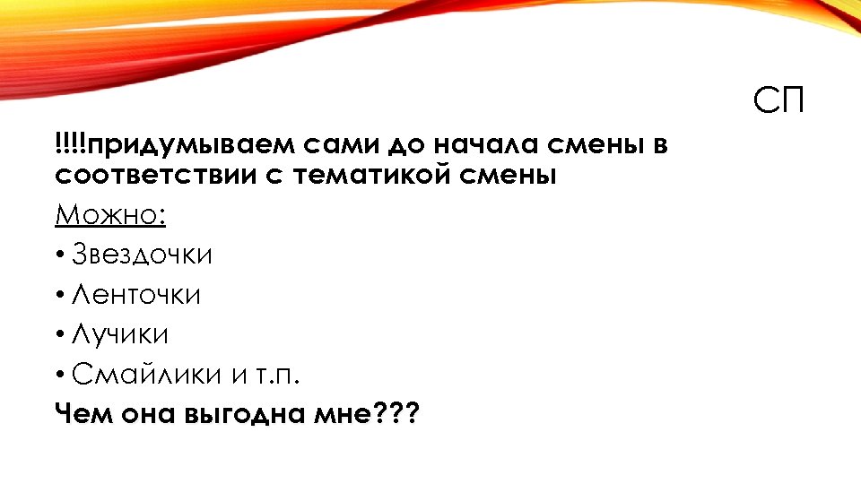 СП !!!!придумываем сами до начала смены в соответствии с тематикой смены Можно: • Звездочки • Ленточки • Лучики • Смайлики и т. п. Чем она выгодна мне? ? ?