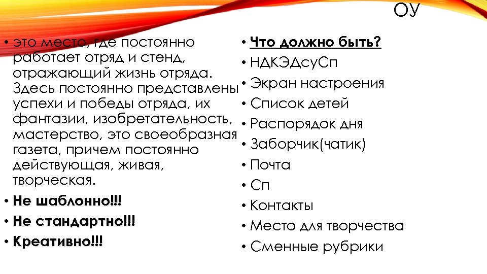 ОУ • это место, где постоянно • Что должно быть? работает отряд и стенд, • НДКЭДсу. Сп отражающий жизнь отряда. Здесь постоянно представлены • Экран настроения • Список детей успехи и победы отряда, их фантазии, изобретательность, • Распорядок дня мастерство, это своеобразная • Заборчик(чатик) газета, причем постоянно • Почта действующая, живая, творческая. • Сп • Не шаблонно!!! • Контакты • Не стандартно!!! • Место для творчества • Креативно!!! • Сменные рубрики