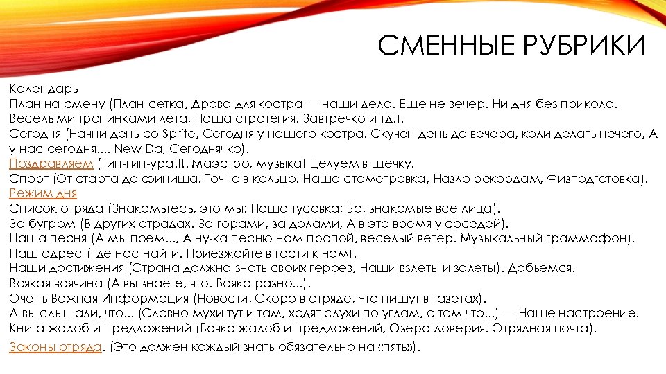 СМЕННЫЕ РУБРИКИ Календарь План на смену (План сетка, Дрова для костра — наши дела. Еще не вечер. Ни дня без прикола. Веселыми тропинками лета, Наша стратегия, Завтречко и тд. ). Сегодня (Начни день со Sprite, Сегодня у нашего костра. Скучен день до вечера, коли делать нечего, А у нас сегодня. . New Da, Сегоднячко). Поздравляем (Гип гип ура!!!. Маэстро, музыка! Целуем в щечку. Спорт (От старта до финиша. Точно в кольцо. Наша стометровка, Назло рекордам, Физподготовка). Режим дня Список отряда (Знакомьтесь, это мы; Наша тусовка; Ба, знакомые все лица). За бугром (В других отрадах. За горами, за долами, А в это время у соседей). Наша песня (А мы поем. . . , А ну ка песню нам пропой, веселый ветер. Музыкальный граммофон). Наш адрес (Где нас найти. Приезжайте в гости к нам). Наши достижения (Страна должна знать своих героев, Наши взлеты и залеты). Добьемся. Всякая всячина (А вы знаете, что. Всяко разно. . . ). Очень Важная Информация (Новости, Скоро в отряде, Что пишут в газетах). А вы слышали, что. . . (Словно мухи тут и там, ходят слухи по углам, о том что. . . ) — Наше настроение. Книга жалоб и предложений (Бочка жалоб и предложений, Озеро доверия. Отрядная почта). Законы отряда. (Это должен каждый знать обязательно на «пять» ).