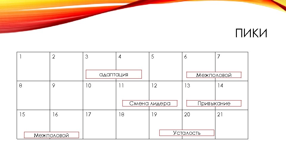 ПИКИ 1 2 3 4 5 6 адаптация 8 9 10 11 Межполовой 12 13 Смена лидера 15 16 Межполовой 17 18 7 19 14 Привыкание 20 Усталость 21
