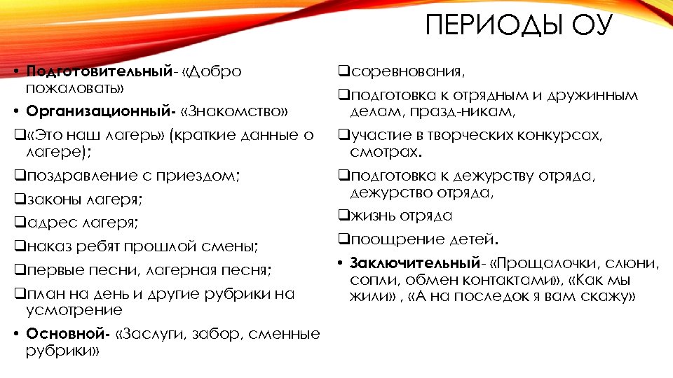ПЕРИОДЫ ОУ • Подготовительный «Добро пожаловать» qсоревнования, • Организационный- «Знакомство» qподготовка к отрядным и дружинным делам, празд никам, q «Это наш лагерь» (краткие данные о лагере); qучастие в творческих конкурсах, смотрах. qпоздравление с приездом; qподготовка к дежурству отряда, дежурство отряда, qзаконы лагеря; qадрес лагеря; qнаказ ребят прошлой смены; qпервые песни, лагерная песня; qплан на день и другие рубрики на усмотрение • Основной- «Заслуги, забор, сменные рубрики» qжизнь отряда qпоощрение детей. • Заключительный «Прощалочки, слюни, сопли, обмен контактами» , «Как мы жили» , «А на последок я вам скажу»