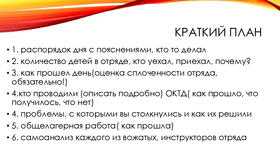 КРАТКИЙ ПЛАН • 1. распорядок дня с пояснениями, кто то делал • 2. количество детей в отряде, кто уехал, приехал, почему? • 3. как прошел день(оценка сплоченности отряда, обязательно!) • 4. кто проводили (описать подробно) ОКТД( как прошло, что получилось, что нет) • 4. проблемы, с которыми вы столкнулись и как их решили • 5. общелагерная работа( как прошла) • 6. самоанализ каждого из вожатых, инструкторов отряда