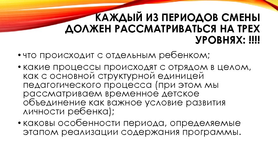 КАЖДЫЙ ИЗ ПЕРИОДОВ СМЕНЫ ДОЛЖЕН РАССМАТРИВАТЬСЯ НА ТРЕХ УРОВНЯХ: !!!! • что происходит с отдельным ребенком; • какие процессы происходят с отрядом в целом, как с основной структурной единицей педагогического процесса (при этом мы рассматриваем временное детское объединение как важное условие развития личности ребенка); • каковы особенности периода, определяемые этапом реализации содержания программы.