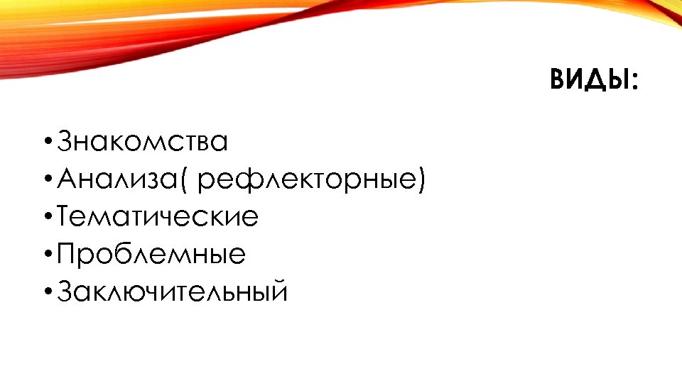 ВИДЫ: • Знакомства • Анализа( рефлекторные) • Тематические • Проблемные • Заключительный