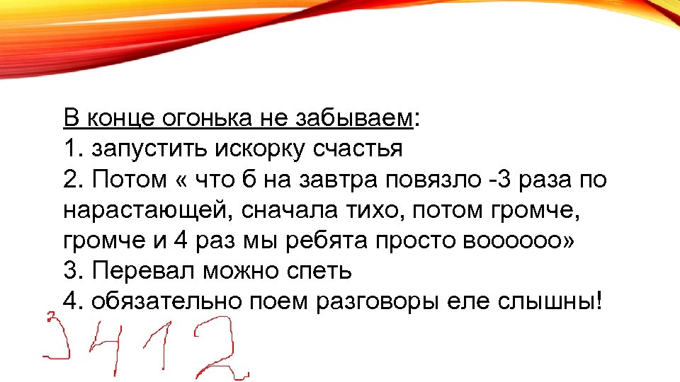 В конце огонька не забываем: 1. запустить искорку счастья 2. Потом « что б на завтра повязло -3 раза по нарастающей, сначала тихо, потом громче, громче и 4 раз мы ребята просто воооооо» 3. Перевал можно спеть 4. обязательно поем разговоры еле слышны!
