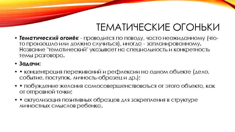 ТЕМАТИЧЕСКИЕ ОГОНЬКИ • Тематический огонёк проводится по поводу, часто неожиданному (что то произошло или должно случиться), иногда запланированному. Название "тематический" указывает на специальность и конкретность темы разговора. • Задачи: • • концентрация переживаний и рефлексии на одном объекте (дело, событие, поступок, личность образец и др. ); • • побуждение желания самосовершенствоваться от этого объекта, как от отправной точки; • • актуализация позитивных образцов для закрепления в структуре личностных смыслов ребенка.