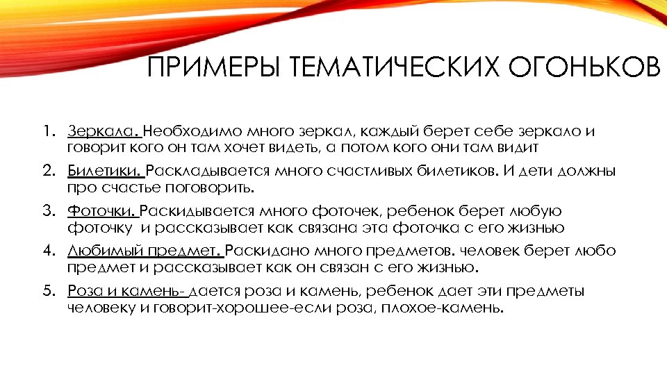 ПРИМЕРЫ ТЕМАТИЧЕСКИХ ОГОНЬКОВ 1. Зеркала. Необходимо много зеркал, каждый берет себе зеркало и говорит кого он там хочет видеть, а потом кого они там видит 2. Билетики. Раскладывается много счастливых билетиков. И дети должны про счастье поговорить. 3. Фоточки. Раскидывается много фоточек, ребенок берет любую фоточку и рассказывает как связана эта фоточка с его жизнью 4. Любимый предмет. Раскидано много предметов. человек берет любо предмет и рассказывает как он связан с его жизнью. 5. Роза и камень дается роза и камень, ребенок дает эти предметы человеку и говорит хорошее если роза, плохое камень.