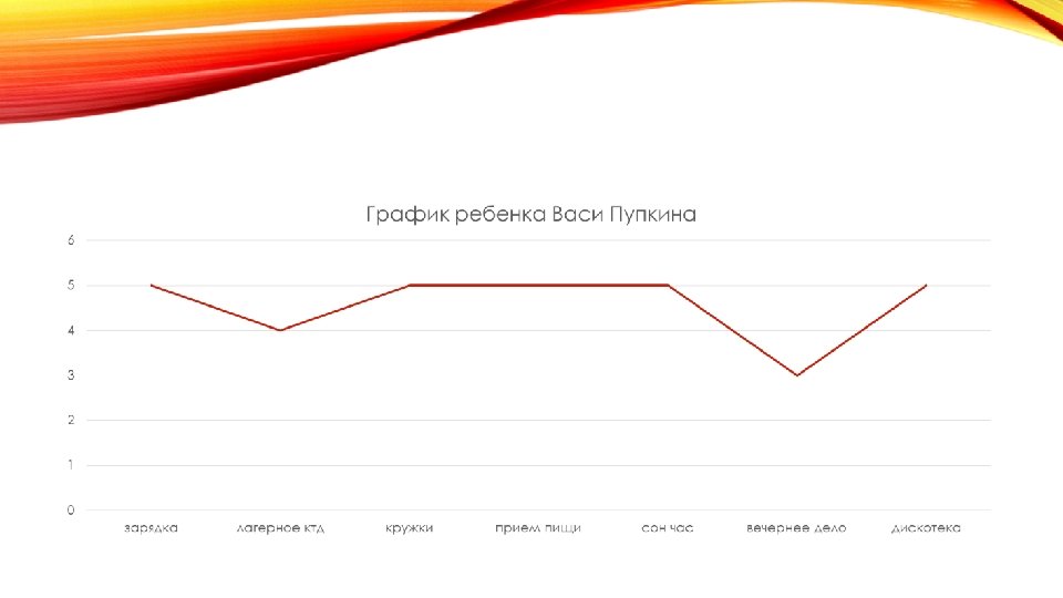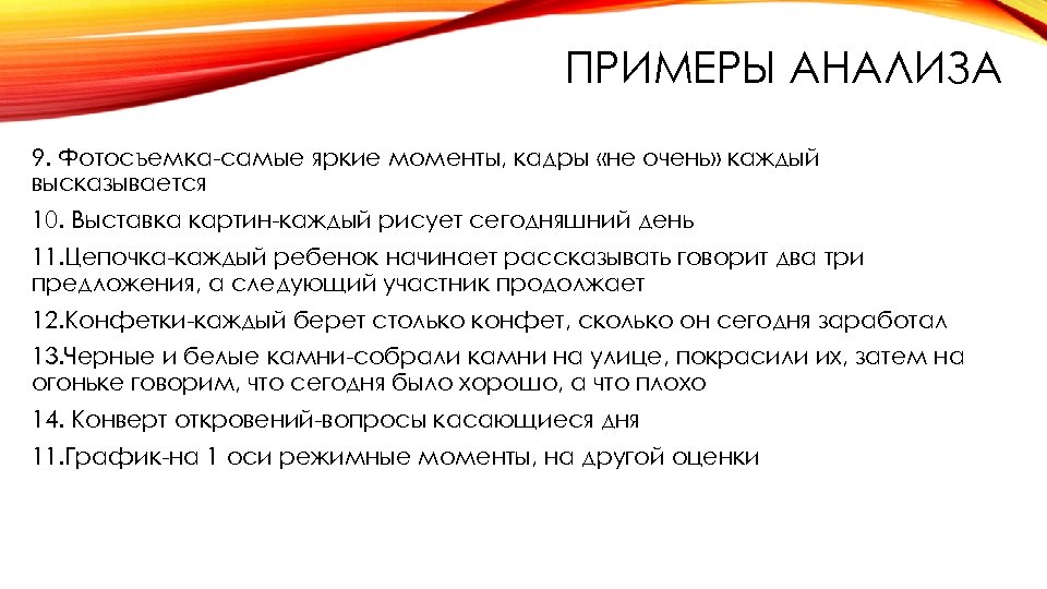 ПРИМЕРЫ АНАЛИЗА 9. Фотосъемка самые яркие моменты, кадры «не очень» каждый высказывается 10. Выставка картин каждый рисует сегодняшний день 11. Цепочка каждый ребенок начинает рассказывать говорит два три предложения, а следующий участник продолжает 12. Конфетки каждый берет столько конфет, сколько он сегодня заработал 13. Черные и белые камни собрали камни на улице, покрасили их, затем на огоньке говорим, что сегодня было хорошо, а что плохо 14. Конверт откровений вопросы касающиеся дня 11. График на 1 оси режимные моменты, на другой оценки
