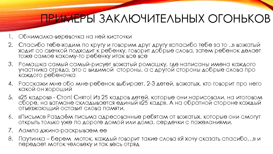ПРИМЕРЫ ЗАКЛЮЧИТЕЛЬНЫХ ОГОНЬКОВ 1. Обнималка веревочка на ней кисточки 2. Спасибо тебе ходим по кругу и говорим другу «спасибо тебе за то. . » вожатый ходит со свечкой подходит к ребенку, говорит добрые слова, затем ребенок делает тоже самое какому то ребенку итак все 3. Ромашка самый рисует вожатый ромашку, где написаны имена каждого участника отряда, это с видимой стороны, а с другой стороны добрые слова про каждого ребеночка 4. Расскажи мне обо мне ребенок выбирает, 2 3 детей, вожатых, кто говорит про него какой он хороший 5. « 25 кадров» Стоп! Снято! Из 25 кадров детей, которые они нарисовали, на итоговом сборе, на ватмане складывается единый « 25 кадр» . А на обратной стороне каждый отъезжающий оставит слова памяти. 6. «Письмо» Раздаём письма адресованные ребятам от вожатых, которые они смогут открыть только уже по дороге домой или дома, сердечки с пожеланиями. 7. Лампа джина раскрываем ее 8. Паутинка – берем моток, каждый говорит такие слова «Я хочу сказать спасибо…» и передает моток человеку и так весь отряд
