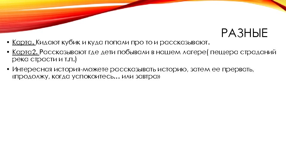 • Карта. Кидают кубик и куда попали про то и рассказывают. РАЗНЫЕ • Карта 2. Рассказывают где дети побывали в нашем лагере( пещера страданий река страсти и т. п. ) • Интересная история можете рассказывать историю, затем ее прервать, «продолжу, когда успокоитесь… или завтра»