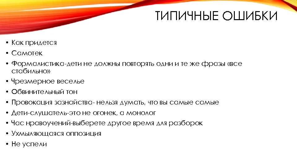 ТИПИЧНЫЕ ОШИБКИ • Как придется • Самотек • Формалистика дети не должны повторять одни и те же фразы «все стабильно» • Чрезмерное веселье • Обвинительный тон • Провокация зазнайства нельзя думать, что вы самые • Дети слушатель это не огонек, а монолог • Час нравоучений выберете другое время для разборок • Ухмыляющаяся оппозиция • Не успели