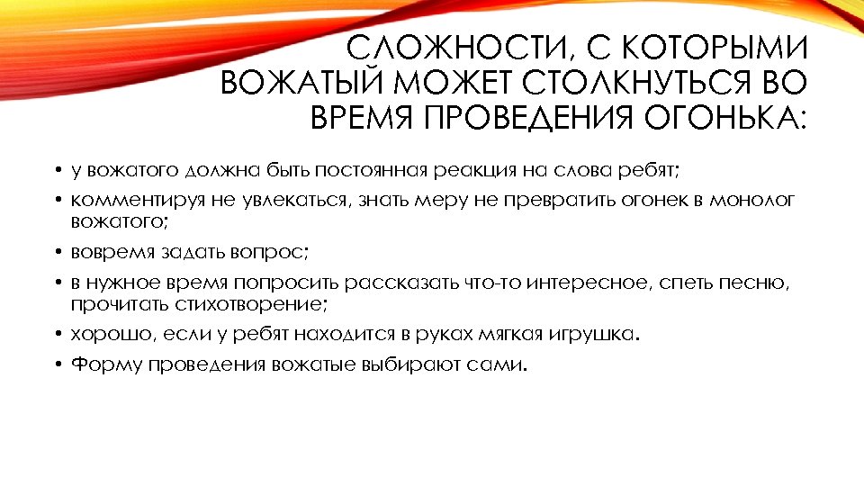 СЛОЖНОСТИ, С КОТОРЫМИ ВОЖАТЫЙ МОЖЕТ СТОЛКНУТЬСЯ ВО ВРЕМЯ ПРОВЕДЕНИЯ ОГОНЬКА: • у вожатого должна быть постоянная реакция на слова ребят; • комментируя не увлекаться, знать меру не превратить огонек в монолог вожатого; • вовремя задать вопрос; • в нужное время попросить рассказать что то интересное, спеть песню, прочитать стихотворение; • хорошо, если у ребят находится в руках мягкая игрушка. • Форму проведения вожатые выбирают сами.