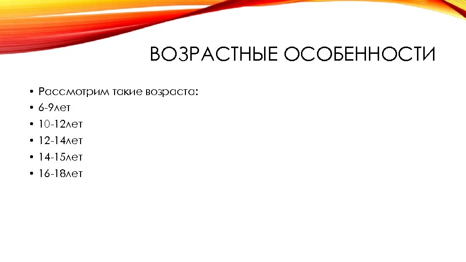 ВОЗРАСТНЫЕ ОСОБЕННОСТИ • Рассмотрим такие возраста: • 6 9 лет • 10 12 лет • 12 14 лет • 14 15 лет • 16 18 лет