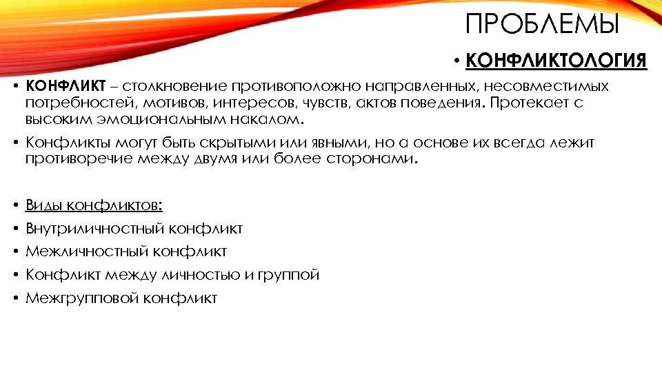 ПРОБЛЕМЫ • КОНФЛИКТОЛОГИЯ • КОНФЛИКТ – столкновение противоположно направленных, несовместимых потребностей, мотивов, интересов, чувств, актов поведения. Протекает с высоким эмоциональным накалом. • Конфликты могут быть скрытыми или явными, но а основе их всегда лежит противоречие между двумя или более сторонами. • Виды конфликтов: • Внутриличностный конфликт • Межличностный конфликт • Конфликт между личностью и группой • Межгрупповой конфликт