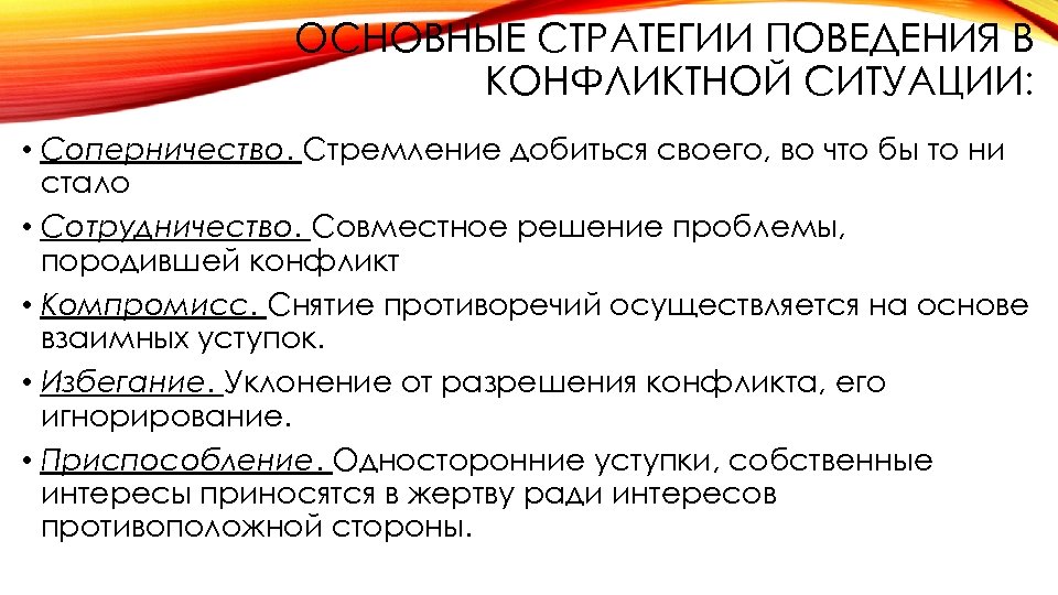 ОСНОВНЫЕ СТРАТЕГИИ ПОВЕДЕНИЯ В КОНФЛИКТНОЙ СИТУАЦИИ: • Соперничество. Стремление добиться своего, во что бы то ни стало • Сотрудничество. Совместное решение проблемы, породившей конфликт • Компромисс. Снятие противоречий осуществляется на основе взаимных уступок. • Избегание. Уклонение от разрешения конфликта, его игнорирование. • Приспособление. Односторонние уступки, собственные интересы приносятся в жертву ради интересов противоположной стороны.