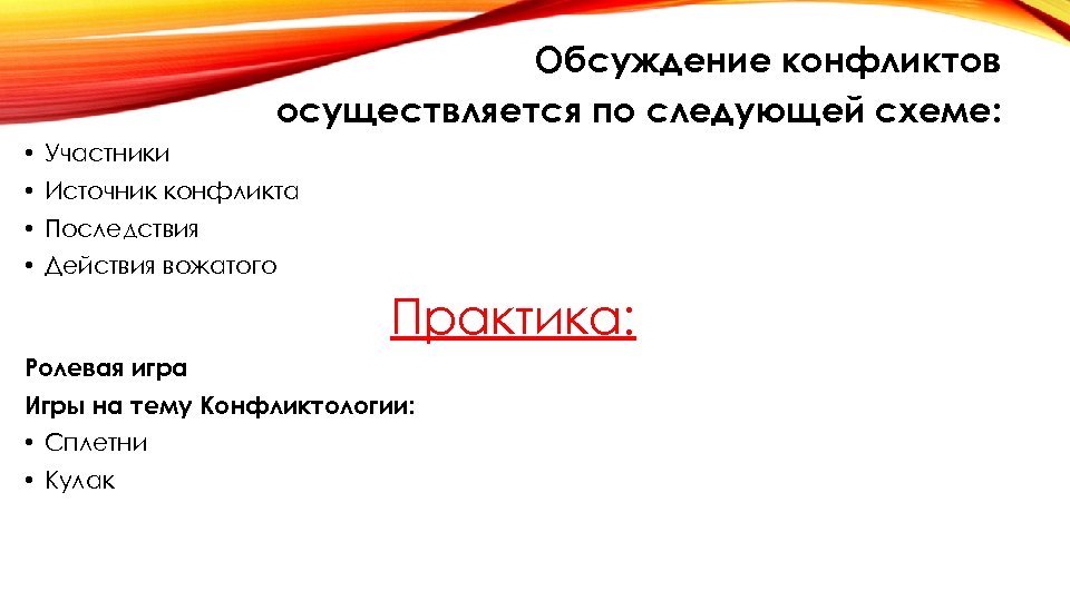 Обсуждение конфликтов осуществляется по следующей схеме: • Участники • Источник конфликта • Последствия • Действия вожатого Практика: Ролевая игра Игры на тему Конфликтологии: • Сплетни • Кулак