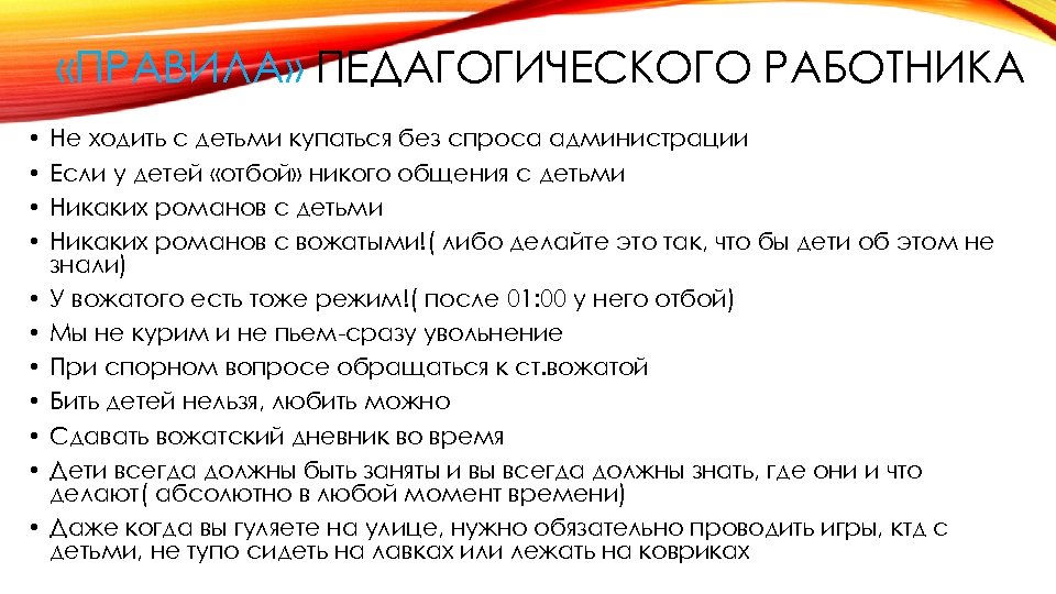 «ПРАВИЛА» ПЕДАГОГИЧЕСКОГО РАБОТНИКА • • • Не ходить с детьми купаться без спроса администрации Если у детей «отбой» никого общения с детьми Никаких романов с вожатыми!( либо делайте это так, что бы дети об этом не знали) У вожатого есть тоже режим!( после 01: 00 у него отбой) Мы не курим и не пьем сразу увольнение При спорном вопросе обращаться к ст. вожатой Бить детей нельзя, любить можно Сдавать вожатский дневник во время Дети всегда должны быть заняты и вы всегда должны знать, где они и что делают( абсолютно в любой момент времени) Даже когда вы гуляете на улице, нужно обязательно проводить игры, ктд с детьми, не тупо сидеть на лавках или лежать на ковриках