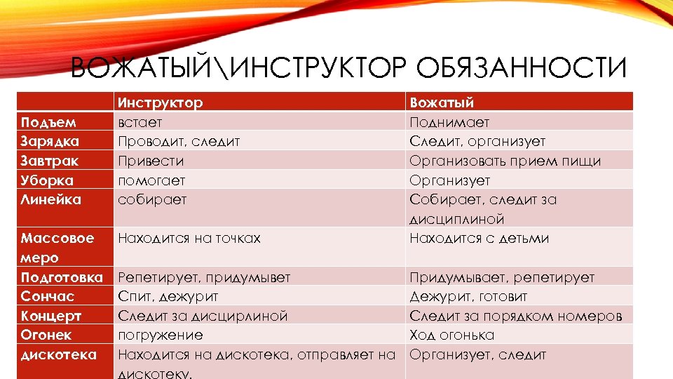 ВОЖАТЫЙИНСТРУКТОР ОБЯЗАННОСТИ Подъем Зарядка Завтрак Уборка Линейка Инструктор встает Проводит, следит Привести помогает собирает Массовое меро Подготовка Сончас Концерт Огонек дискотека Находится на точках Репетирует, придумывет Спит, дежурит Следит за дисцирлиной погружение Находится на дискотека, отправляет на дискотеку. Вожатый Поднимает Следит, организует Организовать прием пищи Организует Собирает, следит за дисциплиной Находится с детьми Придумывает, репетирует Дежурит, готовит Следит за порядком номеров Ход огонька Организует, следит
