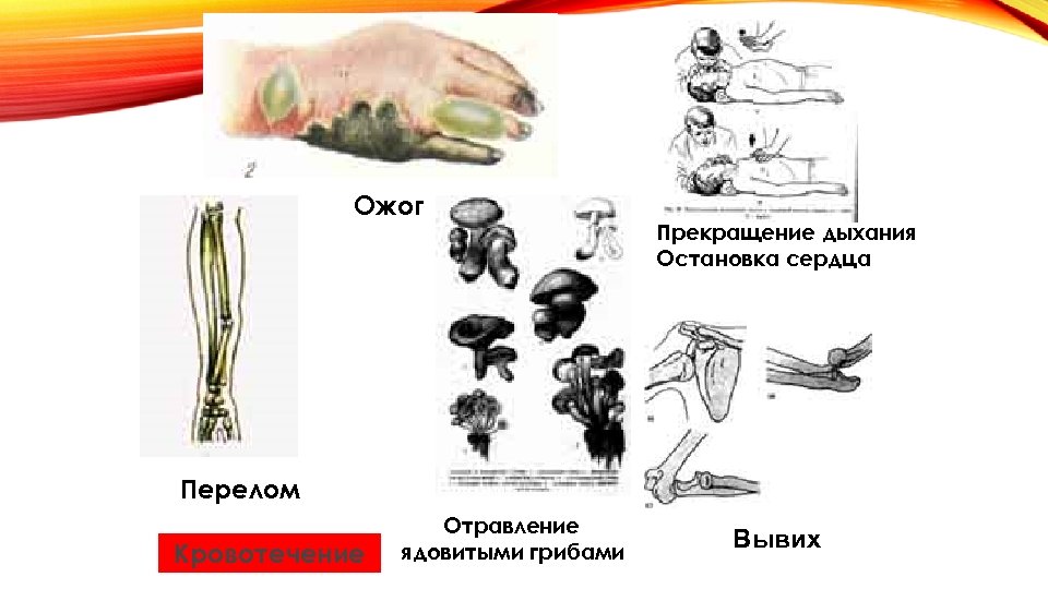 Ожог Прекращение дыхания Остановка сердца Перелом Кровотечение Отравление ядовитыми грибами Вывих