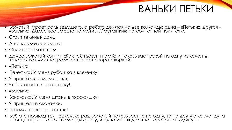 ВАНЬКИ ПЕТЬКИ • Вожатый играет роль ведущего, а ребята делятся на две команды: одна – «Петьки» , другая – «Васьки» . Далее все вместе на мотив «Смуглянки» : На солнечной поляночке • Стоит зелёный дом. • А на крылечке домика • Сидит весёлый гном. • Далее вожатый кричит: «Как тебя зовут, гном? » и показывает рукой на одну из команд, которая как можно громче отвечает скороговоркой. • «Петьки» : • Пе е тька! У меня рубашка в кле е тку! • Я пришёл к вам, де е тки, • Чтобы съесть конфе е тку! • «Васьки» : • Ва а ська! У меня штаны в горо о шку! • Я пришёл из ска а зки, • Потому что я хоро о ший! • Всё это проводится несколько раз, вожатый показывает то на одну, то на другую ко манду, а в конце игры – на обе команды сразу, и одна из них должна перекричать другую.