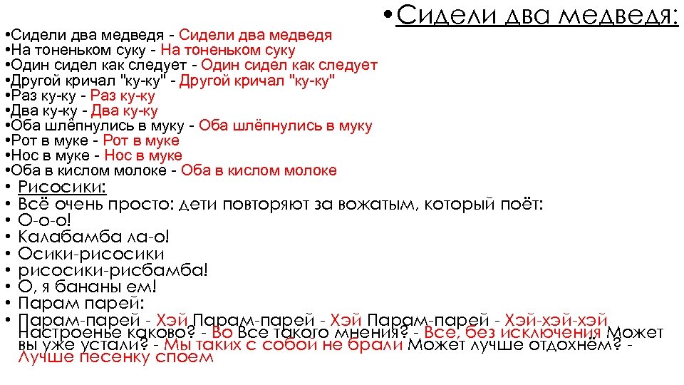 • Сидели два медведя - Сидели два медведя • На тоненьком суку - На тоненьком суку • Один сидел как следует - Один сидел как следует • Другой кричал "ку-ку" - Другой кричал "ку-ку" • Раз ку-ку - Раз ку-ку • Два ку-ку - Два ку-ку • Оба шлёпнулись в муку - Оба шлёпнулись в муку • Рот в муке - Рот в муке • Нос в муке - Нос в муке • Оба в кислом молоке - Оба в кислом молоке • • • Сидели два медведя: Рисосики: Всё очень просто: дети повторяют за вожатым, который поёт: О о о! Калабамба ла о! Осики рисосики рисбамба! О, я бананы ем! Парам парей: Парам парей Хэй хэй Настроенье каково? Во Все такого мнения? Все, без исключения Может вы уже устали? Мы таких с собой не брали Может лучше отдохнём? Лучше песенку споем