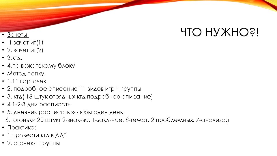 ЧТО НУЖНО? ! Зачеты: 1. зачет ит(1) 2. зачет ит(2) 3. ктд. 4. по вожатскому блоку Метод папку 1. 11 карточек 2. подробное описание 11 видов игр 1 группы 3. ктд( 18 штук отрядных ктд подробное описание) 4. 1 2 3 дни расписать 5. дневник расписать хотя бы один день 6. огоньки 20 штук( 2 знак во, 1 закл ное, 8 темат, 2 проблемных, 7 анализа. ) • Практика: • 1. провести ктд в ДДТ • 2. огонек 1 группы • • •