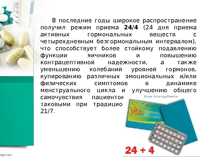 В последние годы широкое распространение получил режим приема 24/4 (24 дня приема активных гормональных веществ с четырехдневным безгормональным интервалом), что способствует более стойкому подавлению функции яичников и повышению контрацептивной надежности, а также уменьшению колебаний уровней гормонов, купированию различных эмоциональных и/или физических симптомов в динамике менструального цикла и улучшению общего самочувствия пациенток по сравнению с таковыми при традиционном режиме приема 21/7.