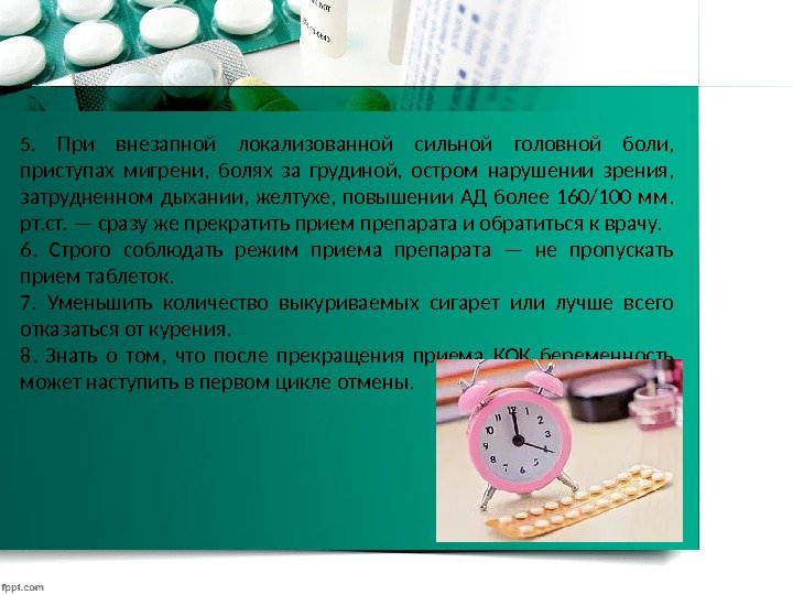 5. При внезапной локализованной сильной головной боли, приступах мигрени, болях за грудиной, остром нарушении зре ния, затрудненном дыхании, желтухе, повышении АД более 160/100 мм. рт. ст. — сразу же прекратить прием препарата и об ратиться к врачу. 6. Строго соблюдать режим приема препарата — не пропус кать прием таблеток. 7. Уменьшить количество выкуриваемых сигарет или лучше всего отказаться от курения. 8. Знать о том, что после прекращения приема КОК бере менность может наступить в первом цикле отмены.