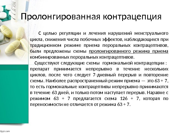 Пролонгированная контрацепция С целью регуляции и лечения нарушений менструального цикла, снижения числа побочных эффектов, наблюдающихся при традиционном режиме приема пероральных контрацепти вов, были предложены схемы пролонгированного режима при ема комбинированных пероральных контрацептивов. Существуют следующие схемы гормональной контрацепции : препарат принимается непрерывно в течение нескольких циклов, после чего следует 7 -дневный перерыв и повторение схемы. Наиболее распространенный режим приема — это 63 + 7, то есть гормональные контрацептивы непрерывно принимаются в течение 63 дней, и только потом наступает перерыв. Наравне с режимом 63 + 7 предлагается схема 126 + 7, которая по переносимости не отличается от режима 63 + 7.