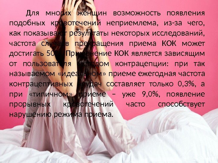 Для многих женщин возможность появления подобных кровотечений неприемлема, из-за чего, как показывают результаты некоторых исследований, частота случаев прекращения приема КОК может достигать 50%. Применение КОК является зависящим от пользователя методом контрацепции: при так называемом «идеальном» приеме ежегодная частота контрацептивных неудач составляет только 0, 3%, а при «типичном» приеме – уже 9, 0%, появление прорывных кровотечений часто способствует нарушению режима приема.