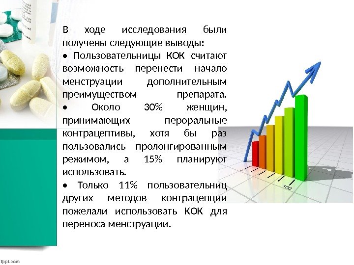 В ходе исследования были получены следующие выводы: • Пользовательницы КОК считают возможность перенести начало менструации дополнительным преимуществом препарата. • Около 30% женщин, принимающих пероральные контрацептивы, хотя бы раз пользовались пролонгированным режимом, а 15% планируют использовать. • Только 11% пользовательниц других методов контрацепции пожелали использовать КОК для переноса менструации.